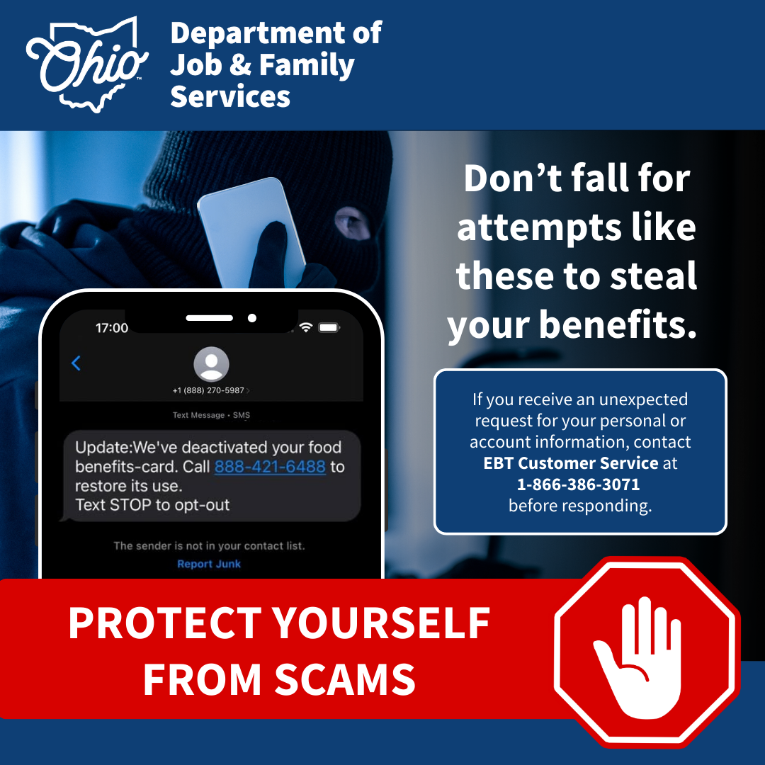 According to the Federal Food and Nutrition Service, Ohio is among a number of states being targeted by criminals stealing Supplemental Nutrition Assistance Program (SNAP) benefits. This is known as skimming. In skimming, criminals use a device placed over a point-of-sale card reader that steals information from payment cards like SNAP EBT and cash assistance cards. This means SNAP or cash assistance benefits could be stolen without you knowing.